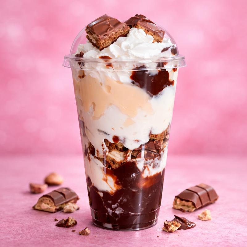 Um copo de 250ml extremamente cremoso e indulgente! Camadas de mousse de Ninho, brigadeiro de Ninho com pedaços generosos de Kinder Bueno, brigadeiro 50% cacau e finalização com Kinder Bueno.