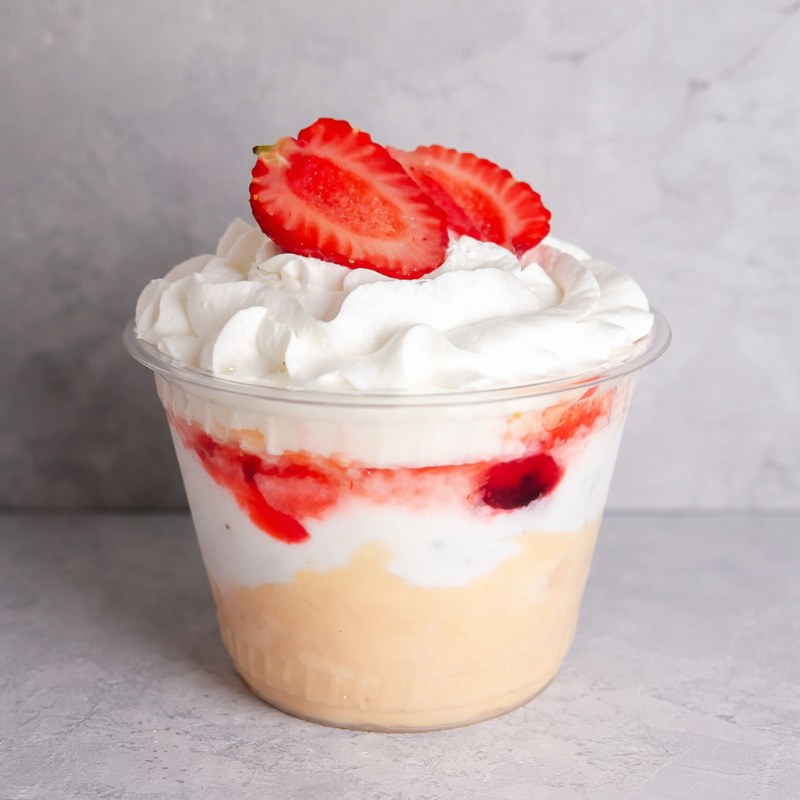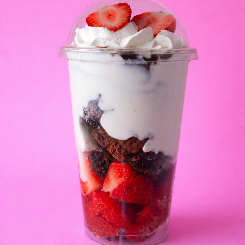Uma sobremesa perfeita para quem ama combinação clássica! Camadas generosas de creme branco super cremoso, morangos fresquinhos, brigadeiro de chocolate e pedaços macios de brownie. Finalizado com mais creme, brownie e mousse de Ninho.