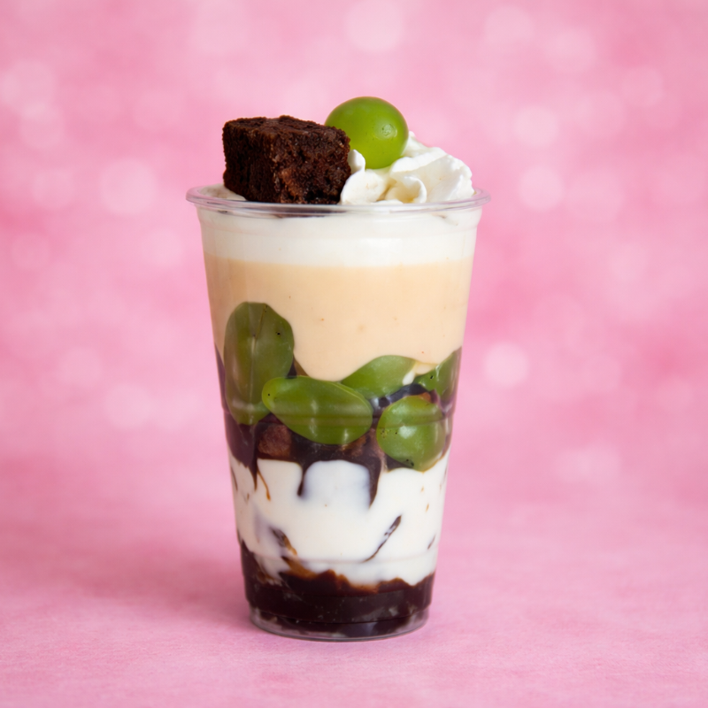 Uma sobremesa perfeita para quem ama combinação clássica! Camadas generosas de creme branco super cremoso, uvas fresquinhas, brigadeiro de chocolate e pedaços macios de brownie. Finalizado com mais creme, brownie e mousse de Ninho. Cada colherada é equilibrada, cremosa e viciante