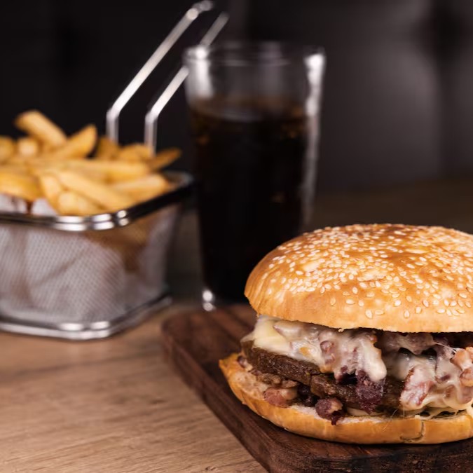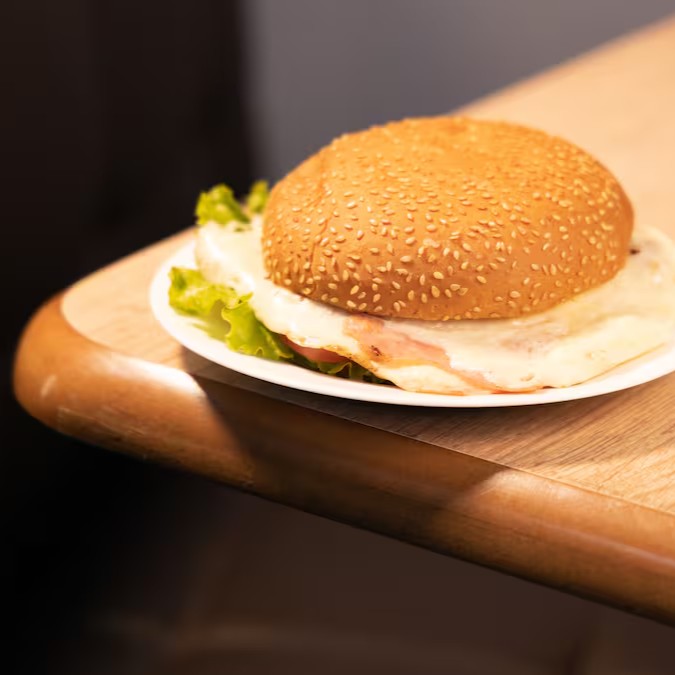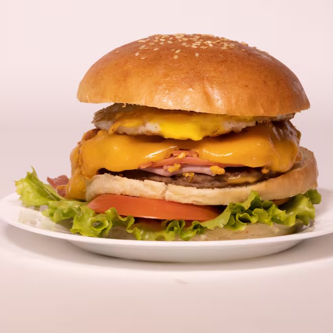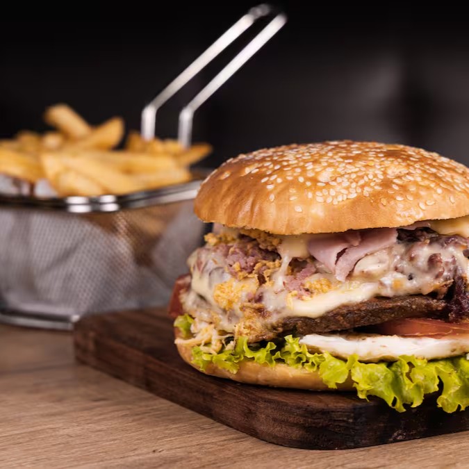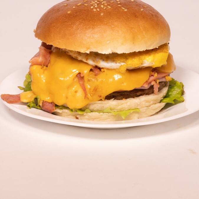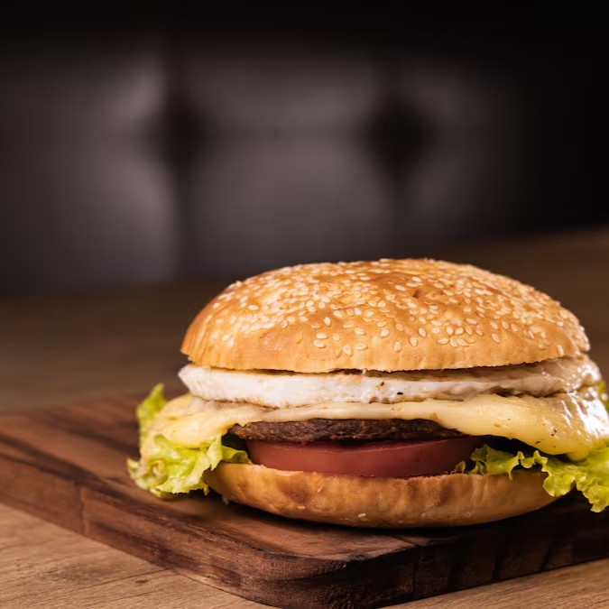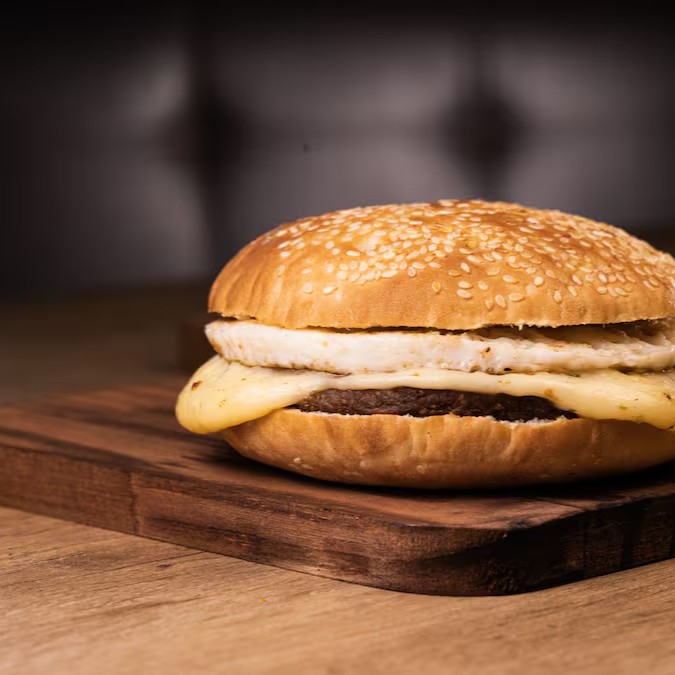 Pão brioche, hambúrguer artesanal, mussarela, ovo, maionese e salada.
