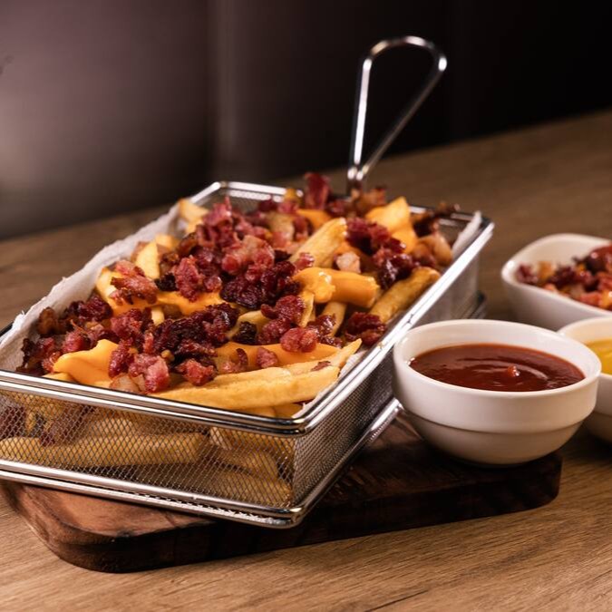 Batatas fritas crocantes, bacon frito e cheddar cremoso.