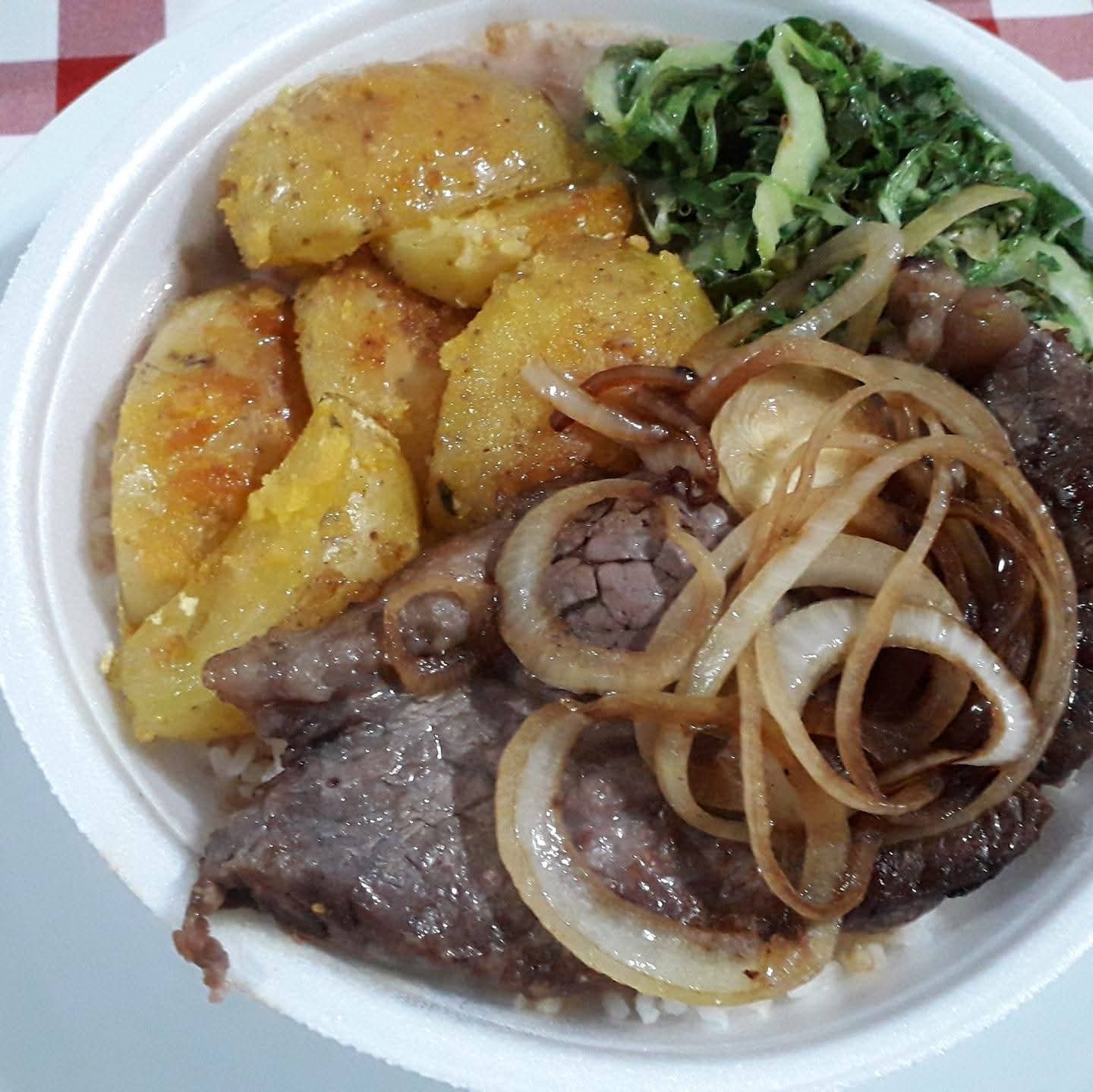 Acompanha 2 Ovos, Arroz, Farofa, Vinagrete e Batata Frita
