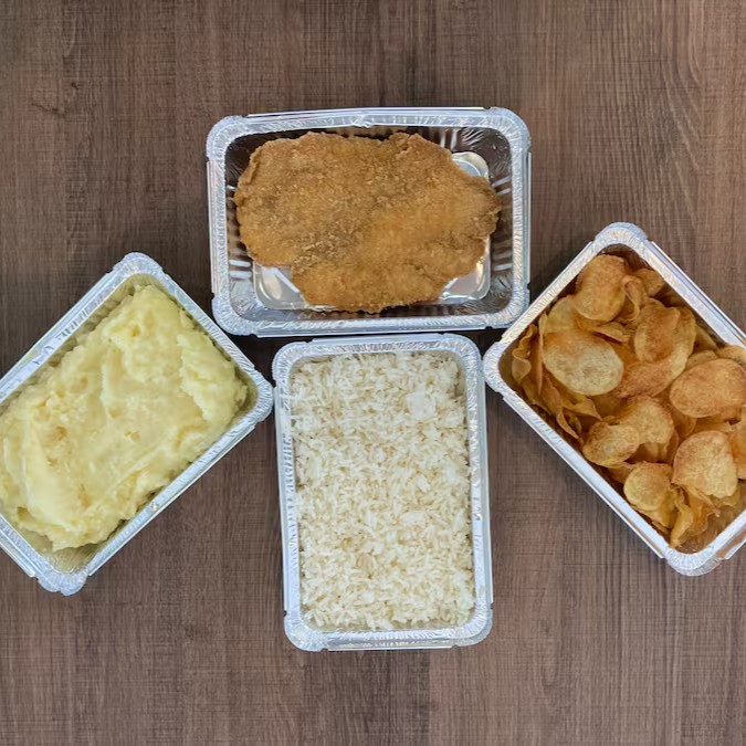Desfrute da nossa autêntica 'Milanesa de Frango da Casa', uma verdadeira ode à fusão de texturas e sabores! Cada filé de frango, meticulosamente empanado, é fritado à perfeição, garantindo uma crocância tentadora por fora e uma suculência inigualável por dentro. O prato é servido com arroz branco, cozido ao ponto certo de suavidade, e acompanha um extra à sua escolha: mix de legumes saudáveis, batatas fritas douradas, chips crocantes ou purê de batatas cremoso, todos preparados com maestria e paixão. O resultado é uma experiência gastronômica única, que une a tradição culinária à frescura e ao alto padrão dos nossos ingredientes. Venha desfrutar do prazer que cada mordida da nossa milanesa de frango promete! #Milanesadefrango #Crocância #Refeiçãocompleta #Acompanhamentosvariados #Fritonahora #Milanesa #Frango.