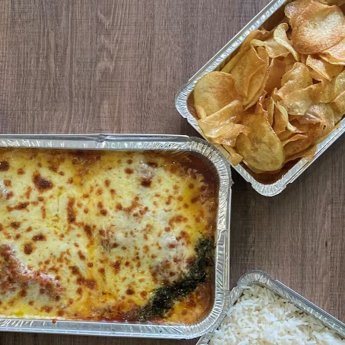 Saboreie o nosso inigualável Parmegiana de Frango da Casa! Cada pedaço revela um filé de frango suculento, meticulosamente empanado em nossa mistura exclusiva de farinhas. Ele vem coroado com nosso molho caseiro de tomates frescos e uma camada irresistível de muçarela gratinada que se derrete sobre o prato, proporcionando um sabor incomparável. É harmoniosamente acompanhado de arroz branco e um acompanhamento à sua escolha: batatas fritas, batatas chips, mix de legumes ou purê. Esta é uma experiência culinária que vai além do comum, unindo texturas e sabores em uma simetria perfeita. Não perca a chance de se deleitar com o melhor da nossa culinária! #Parmegianadefrango #Almoço #Parmegiana #Jantar #Lanche #Promoção #Frango #Frangoempanado #Molhoartesanal #Queijoderretido #Acompanhamentos #Casadaparmegiana