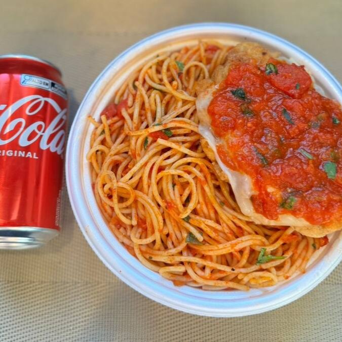 Marmita com delicioso filé de frango parmegiana (empanado na massa crocante coberto com molho de tomates e queijo) acompanhado de macarrão espaguete ao molho de tomates. Acompanha refrigerante lata Coca Cola 350ml bem gelada. Marmita indicada para 01 pessoa.