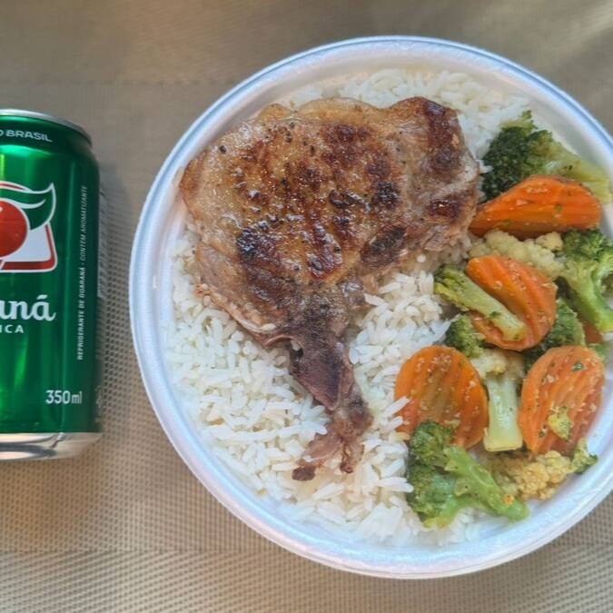 Marmita com deliciosa bisteca suína preparada com arroz branco, feijão e mix de legumes. Acompanha refrigerante lata Guaraná Antárctica lata 350ml bem gelada. Marmita indicada para 01 pessoa.