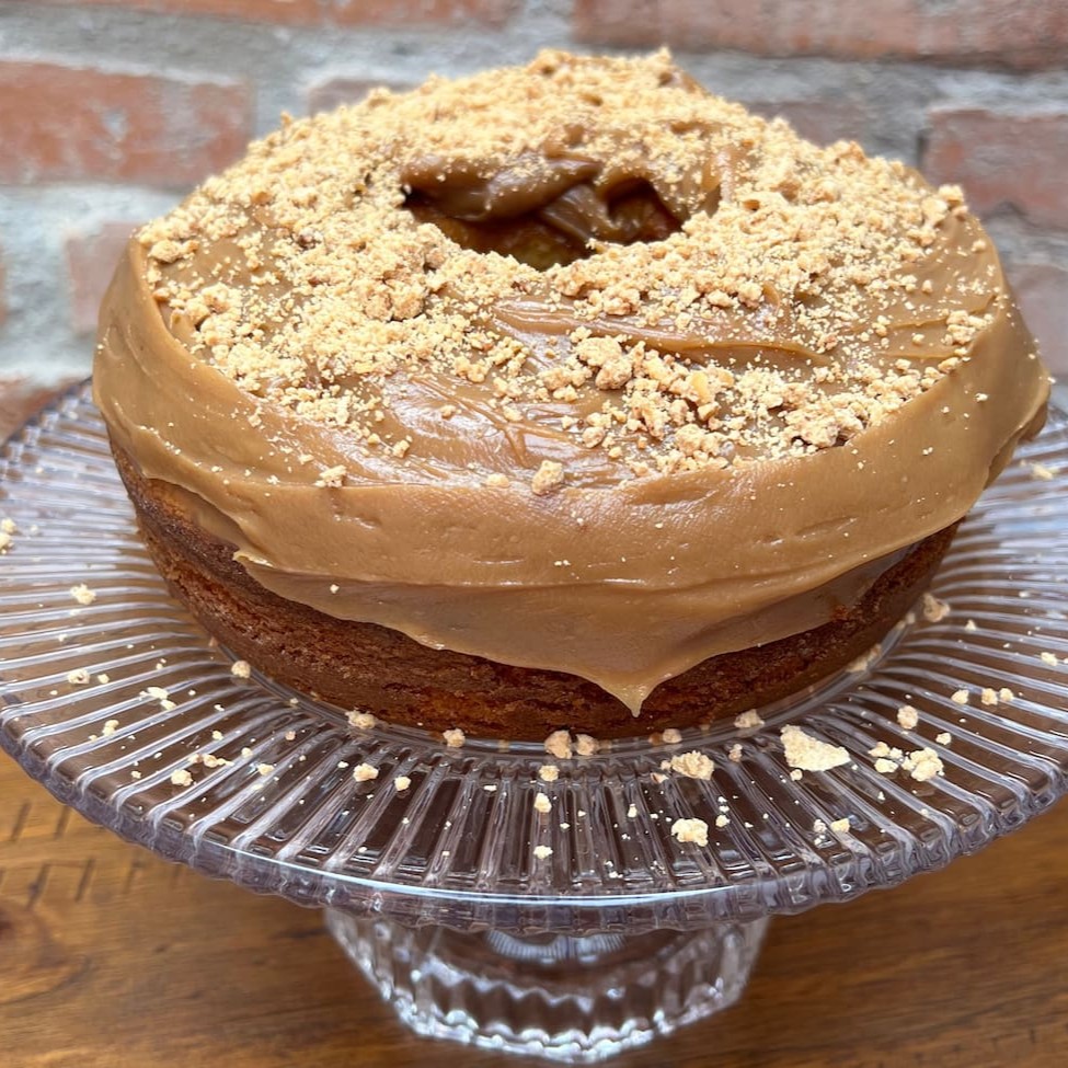 Massa branca com cobertura de Doce de Leite finalizado com paçoca. Tamanho médio (serve 6 fatias generosas).