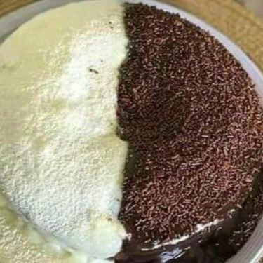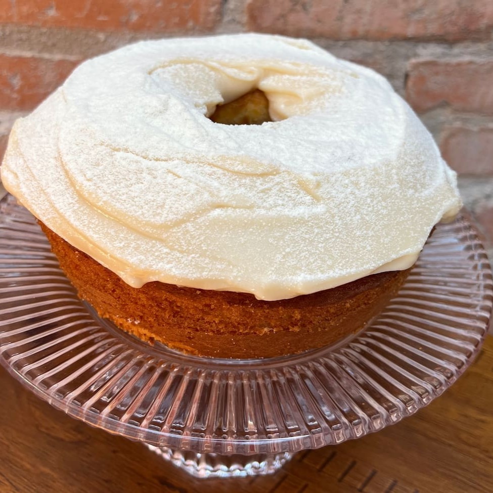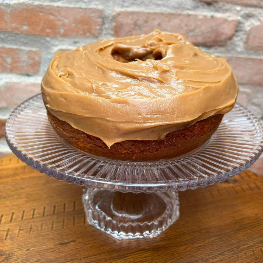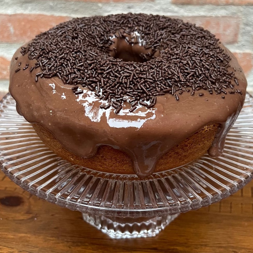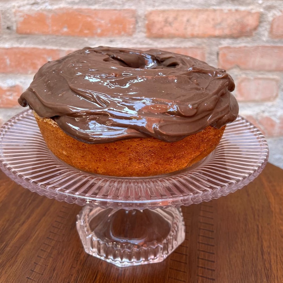 Bolo de massa branca com furo no meio e cobertura de creme de Ninho. Tamanho médio, serve 6 fatias.