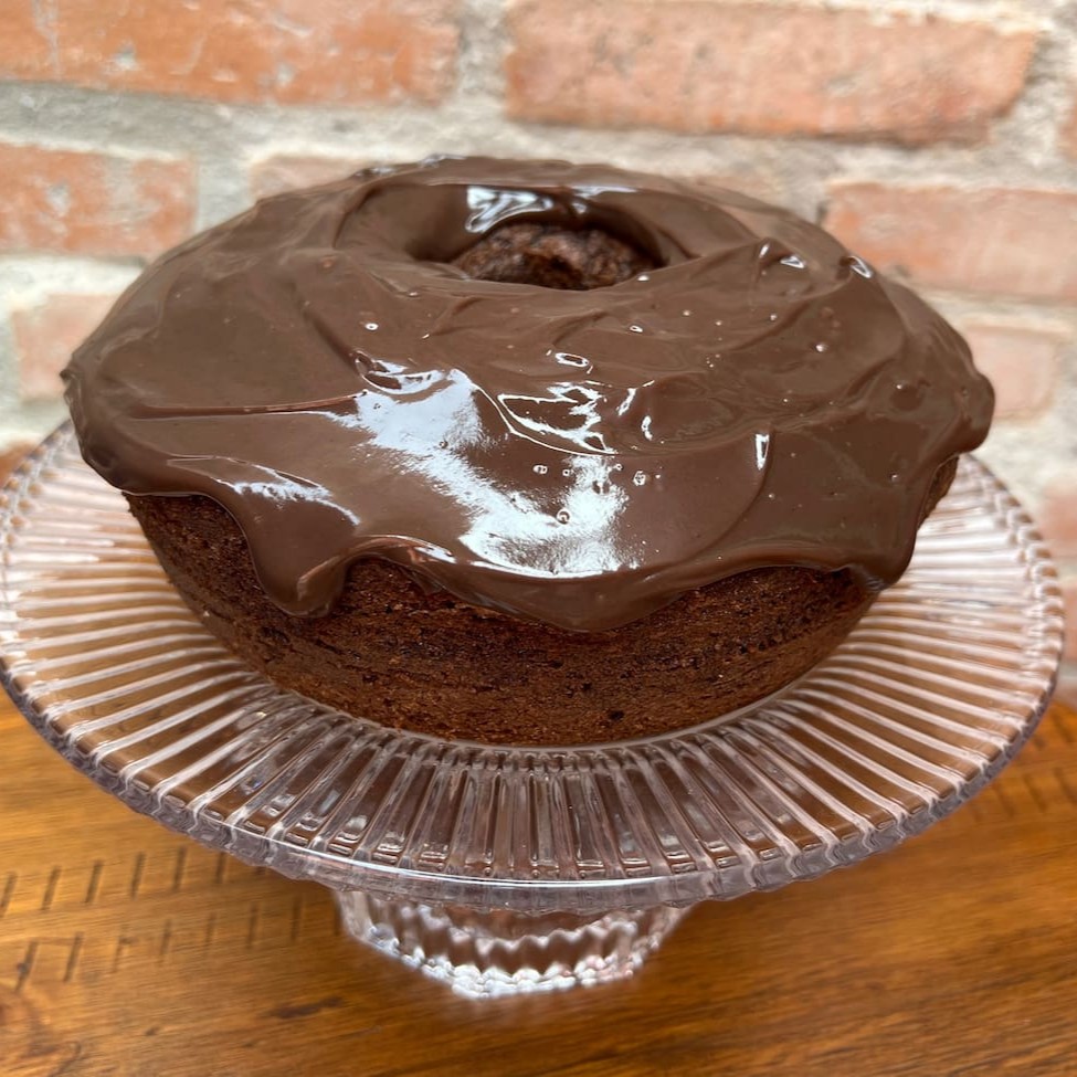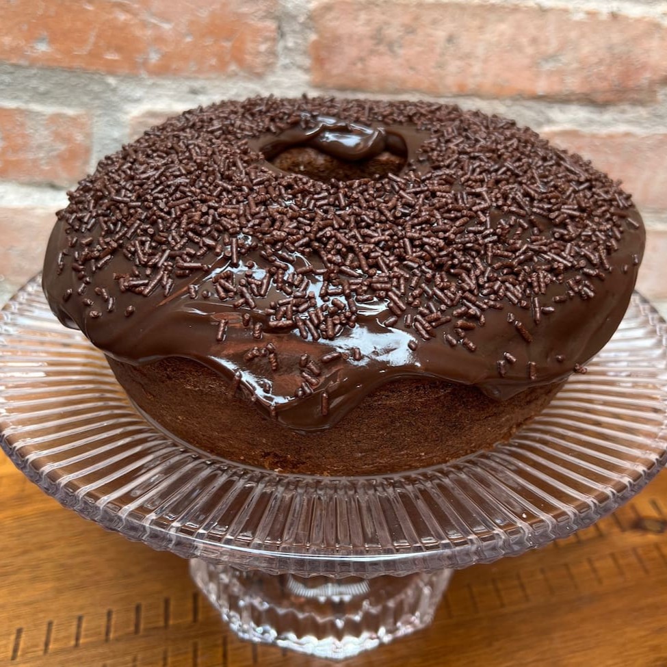 Delicioso bolo de chocolate com cobertura de creme de chocolate. Tamanho médio (serve 6 fatias generosas).