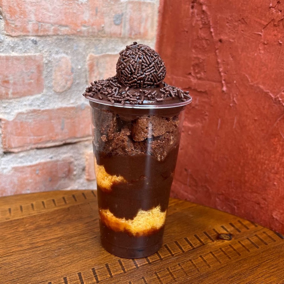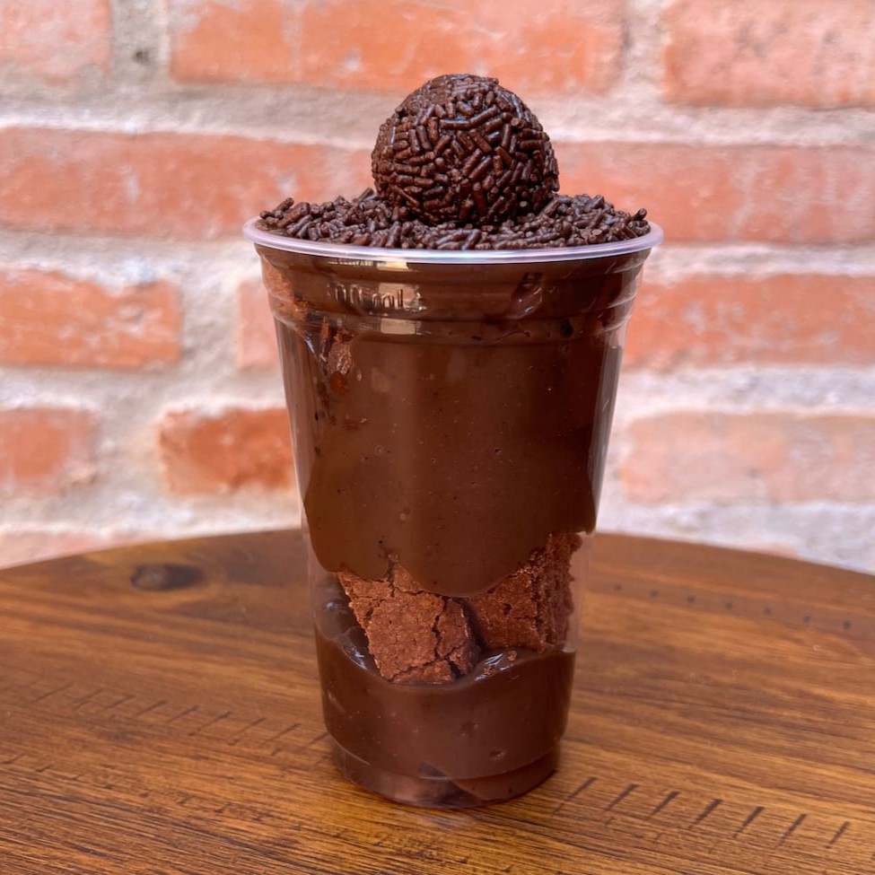 Brownie, creme de brigadeiro, granulado e brigadeiro.