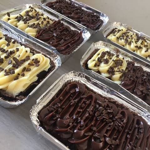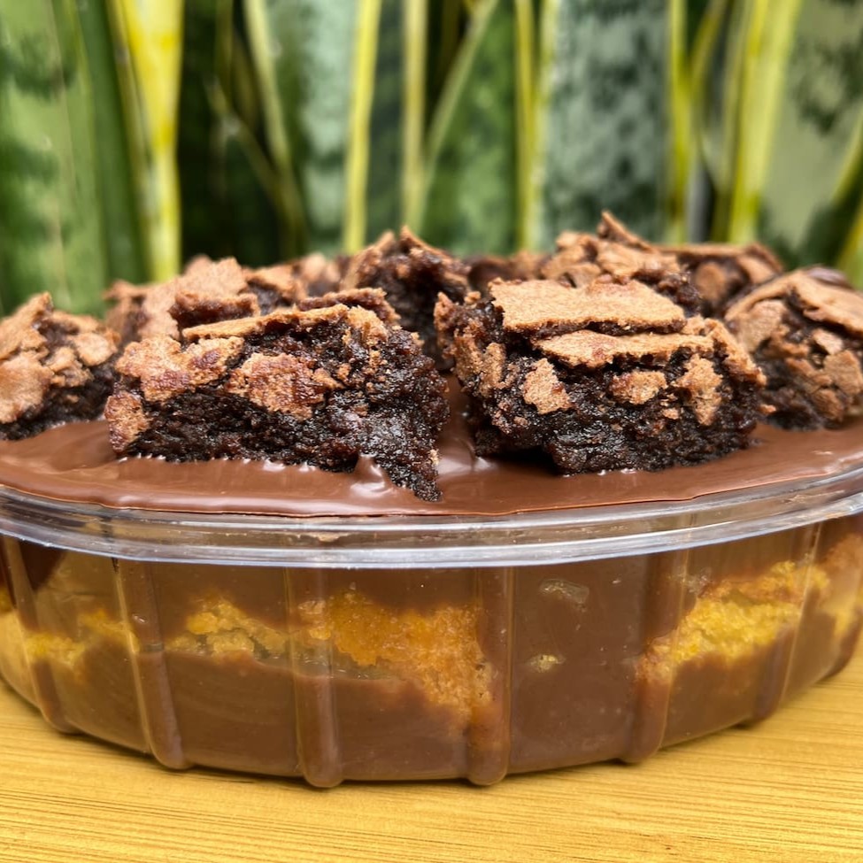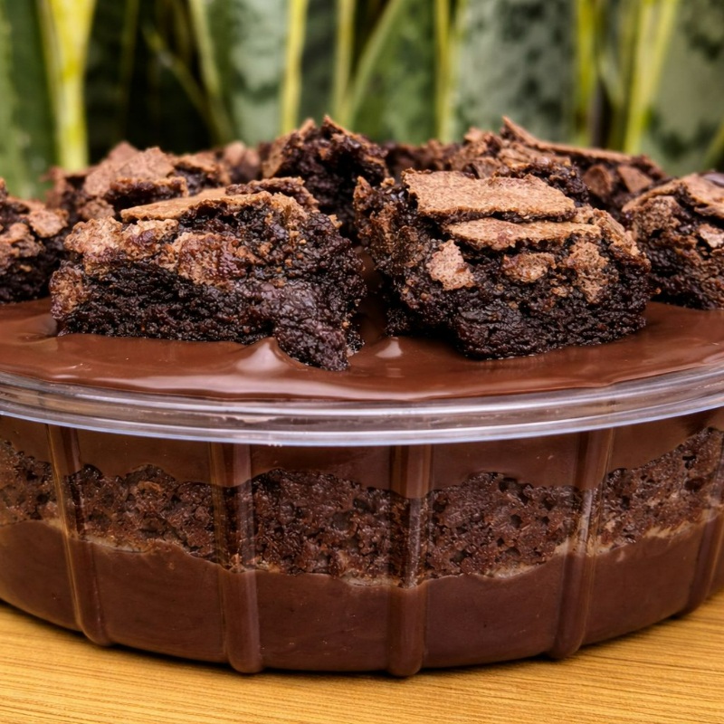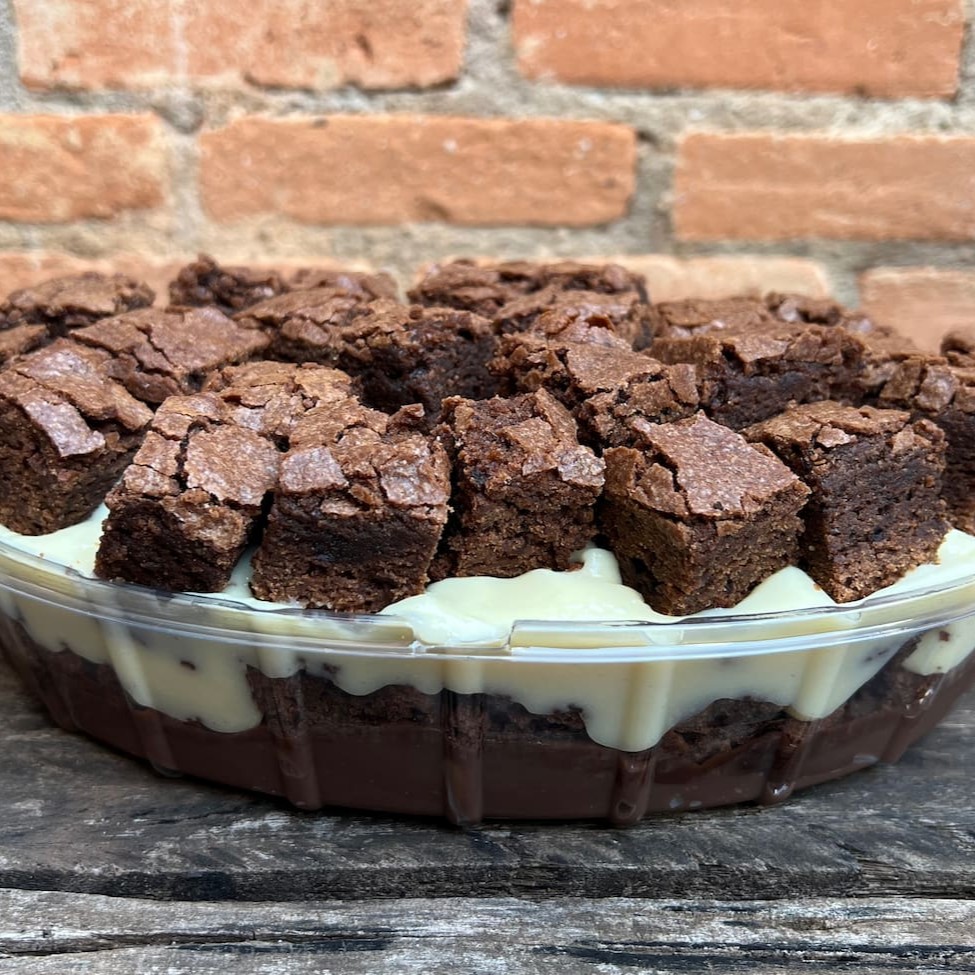 Nosso delicioso Brownie na travessa, uma camada de creme de chocolate, uma camada de Brownie, uma camada de creme de Ninho e deliciosos Brownies para finalizar. Temos duas opções de tamanho: Travessa de 1 Litro que serve até 3 pessoas e Travessa de 2 Litros que até 6 pessoas.
