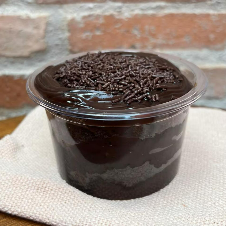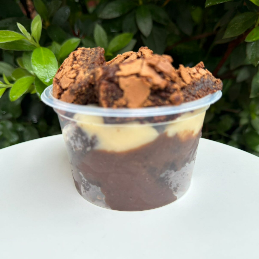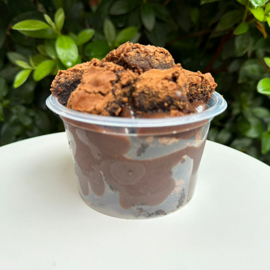 Nosso delicioso Brownie acompanhado com creme de chocolate. Pote 250 ml.