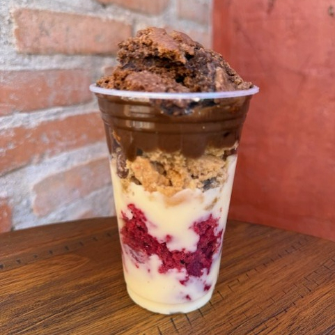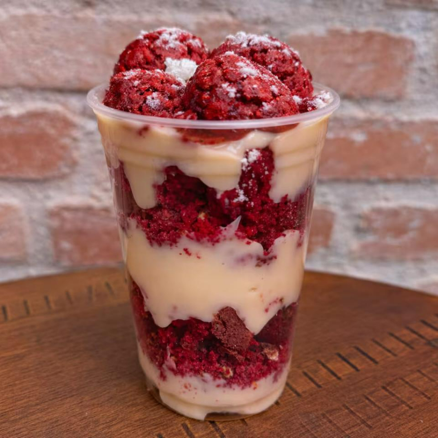 Nossos três cookies no copo da felicidade. Cookie red velvet, cookie tradicional e cookie de chocolate, com creme de ninho e creme de chocolate.