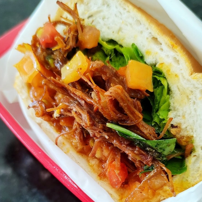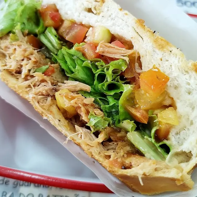 Frango desfiado, alface, rúcula, Tomate e molho especial da casa.