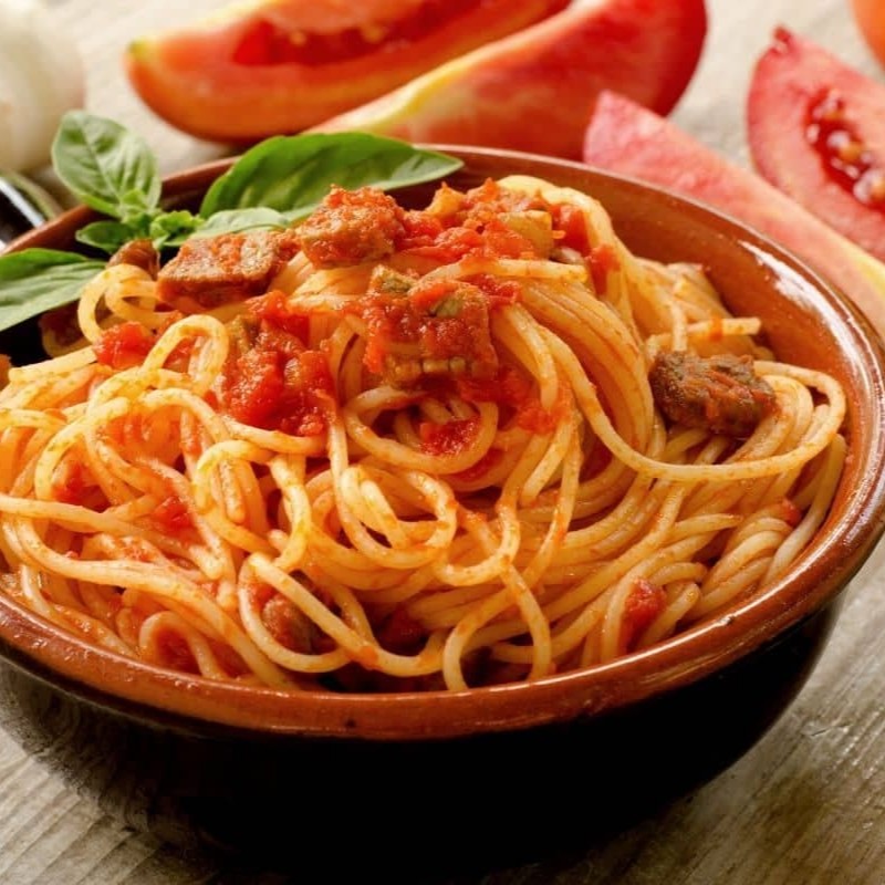 Espaguete ao Molho Vermelho com Calabresa em Cubos.