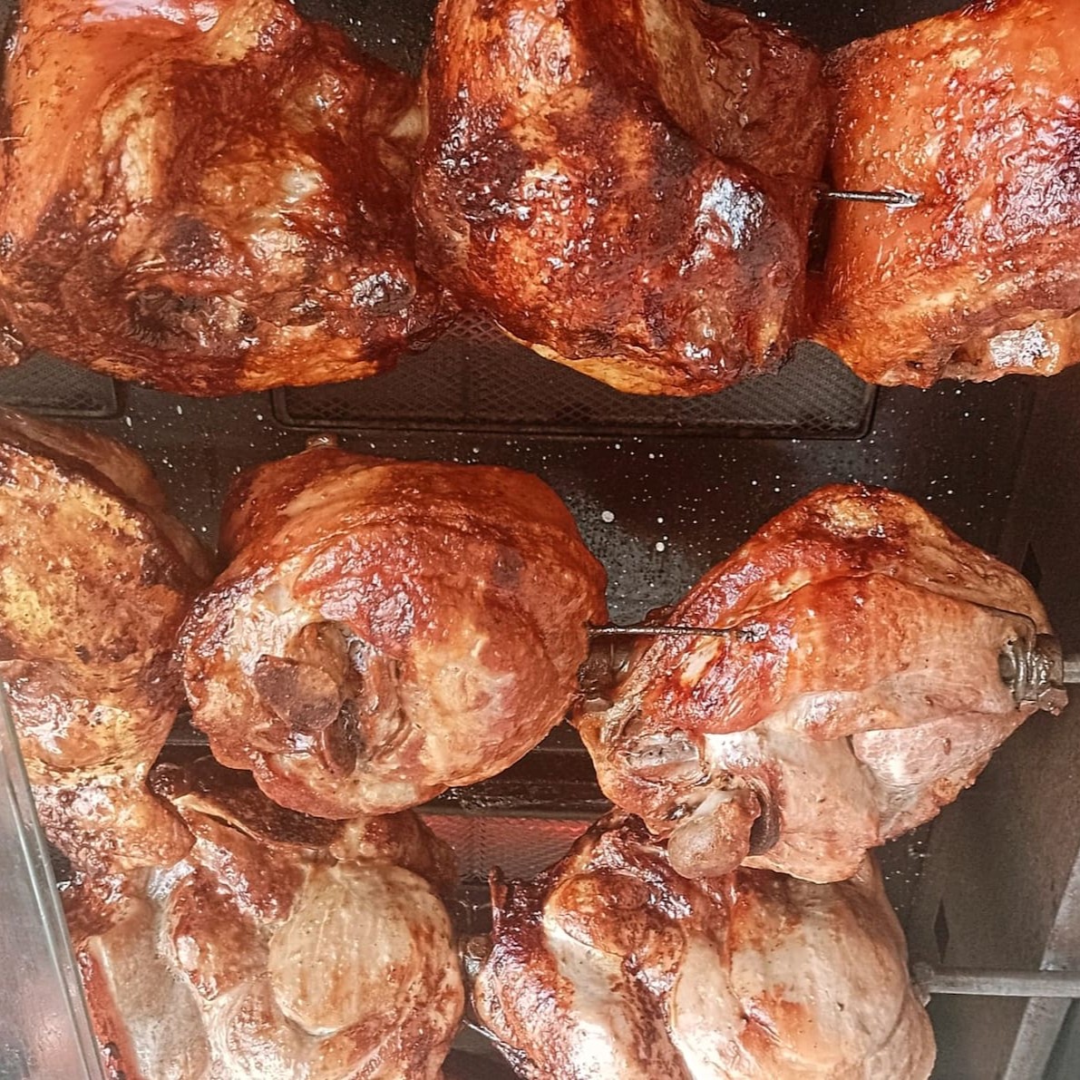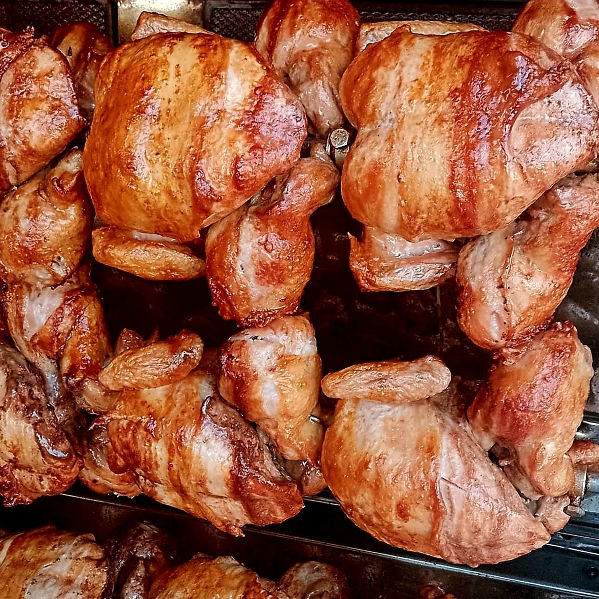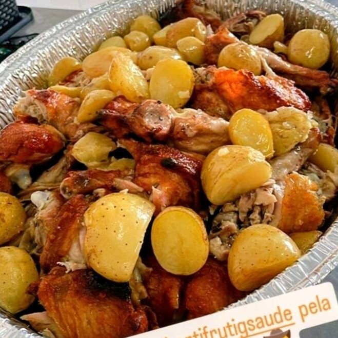 Frango Assado Suculento e Saboroso, acompanha Batatas e Farofa.