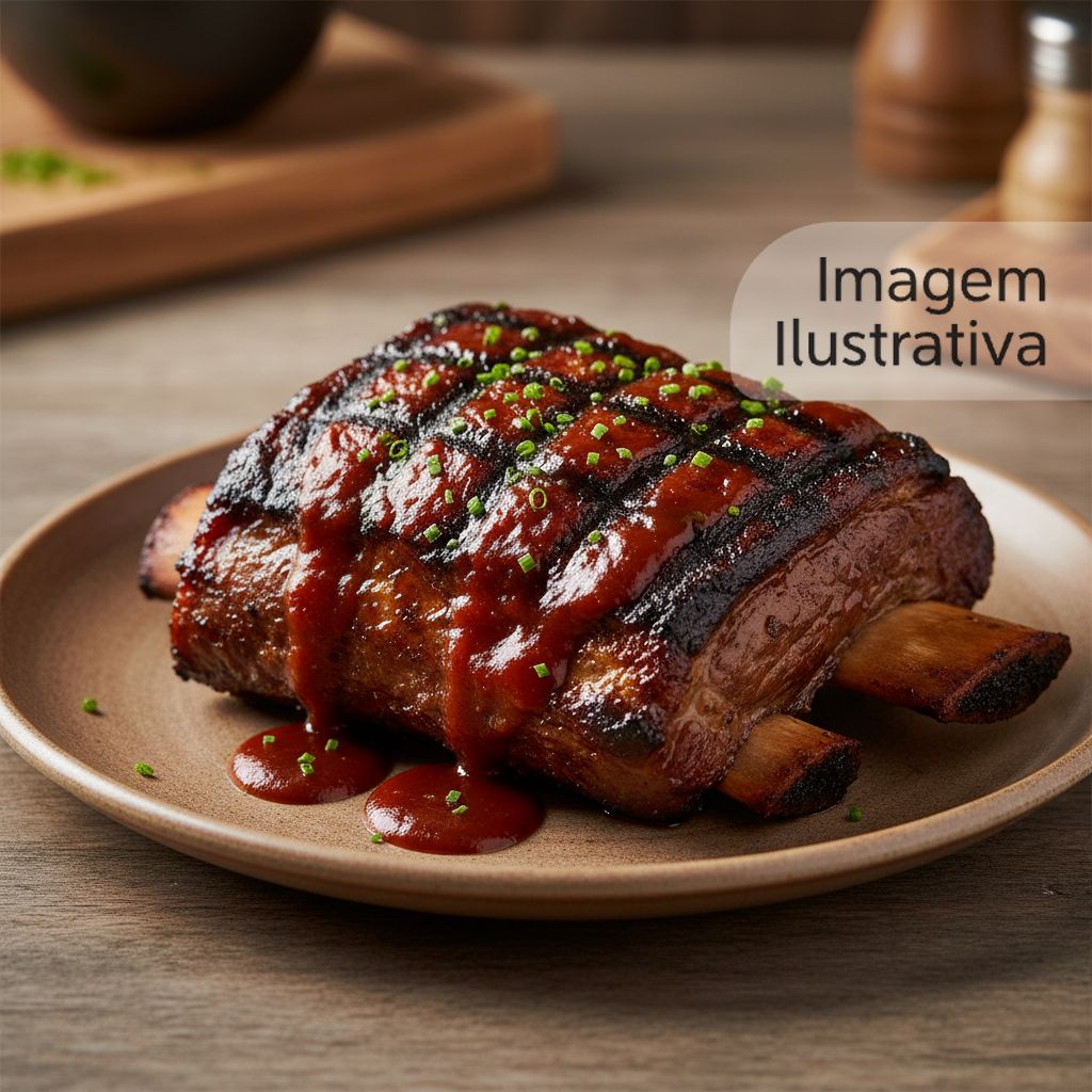 Costela bovina assada lentamente, temperada com alho, sal grosso e ervas finas, servida com molho barbecue.