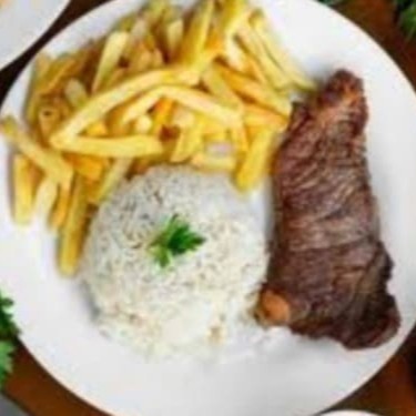 Suculento bife de contra filé acebolado, acompanhado de arroz, ovo frito e purê de batata.