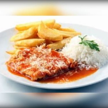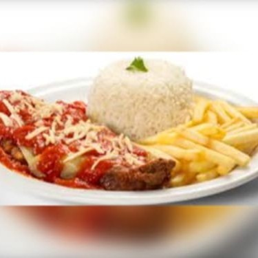 Um bife bovino de patinho à milanesa coberto com molho de tomate e queijo mussarela derretida, acompanha arroz branco e fritas ou purê de batata(a escolher)