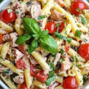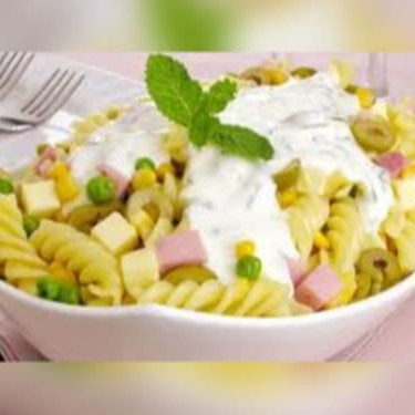 Macarrão, frango desfiado, cenoura ralada, azeitona verde, milho verde, ervilha tudo envolvido em um delicioso molho de iogurte natural, limão, sal e mostarda. Com folhas verdes encima.