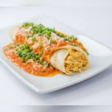 Uma unidade de panqueca recheada com frango e requeijão, coberta com molho de tomate caseiro e queijo mussarela derretido.
