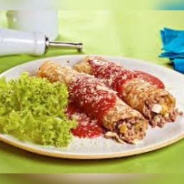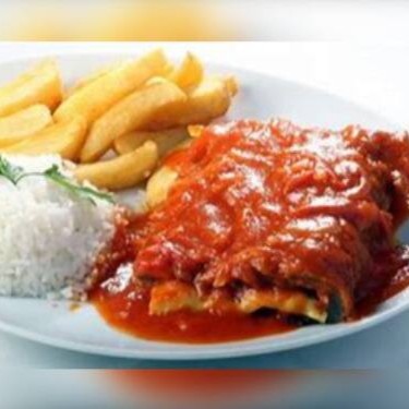 Uma panqueca recheada com uma porção generosa de carne moída, coberta com molho de tomate e queijo, uma porção de arroz branco e salada (folhas, tomate e cebola)