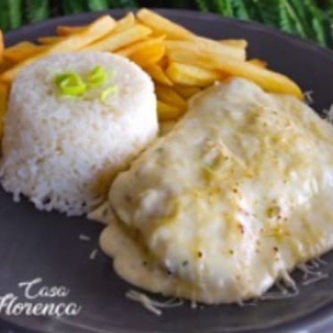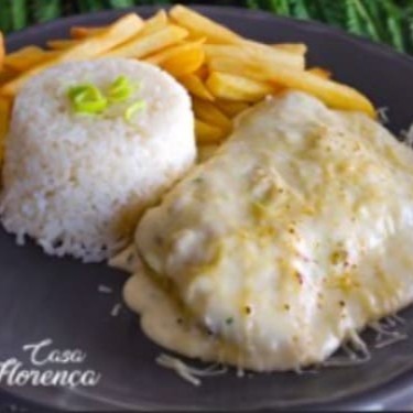 Filé de frango empanado, coberto com mussarela e molho de queijos com alho poró. Acompanha arroz branco e fritas.