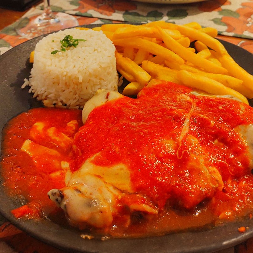Carne super macia, empanada, coberta com molho de tomates caseiros e mussarela. Acompanha arroz branco e fritas.