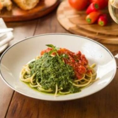 Duas tradições italianas juntos, molho de tomates "ao sugo" e molho pesto de manjericão
