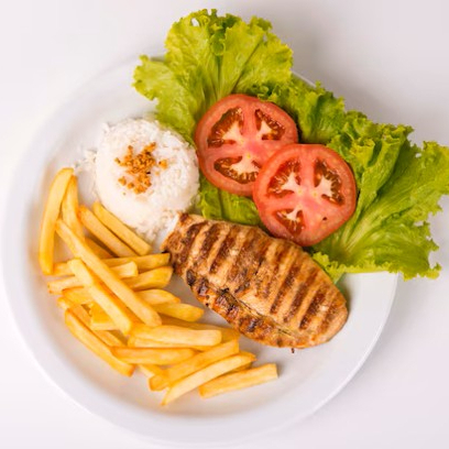 Peito de frango grelhado, acompanhado de arroz branco, fritas e saladinha.
