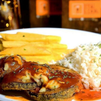 Berinjela empanado, coberto com delicioso molho de tomates caseiros e mussarela. Acompanha arroz branco e fritas.