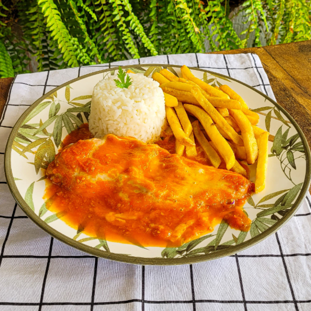 Filé de frango empanado, coberto com delicioso molho de tomates caseiros e mussarela. Acompanha arroz branco e fritas.