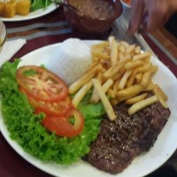 Filé de carne bovina grelhado, acompanhado de arroz branco, fritas e saladinha.