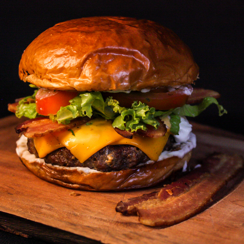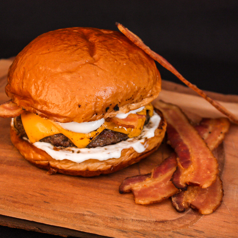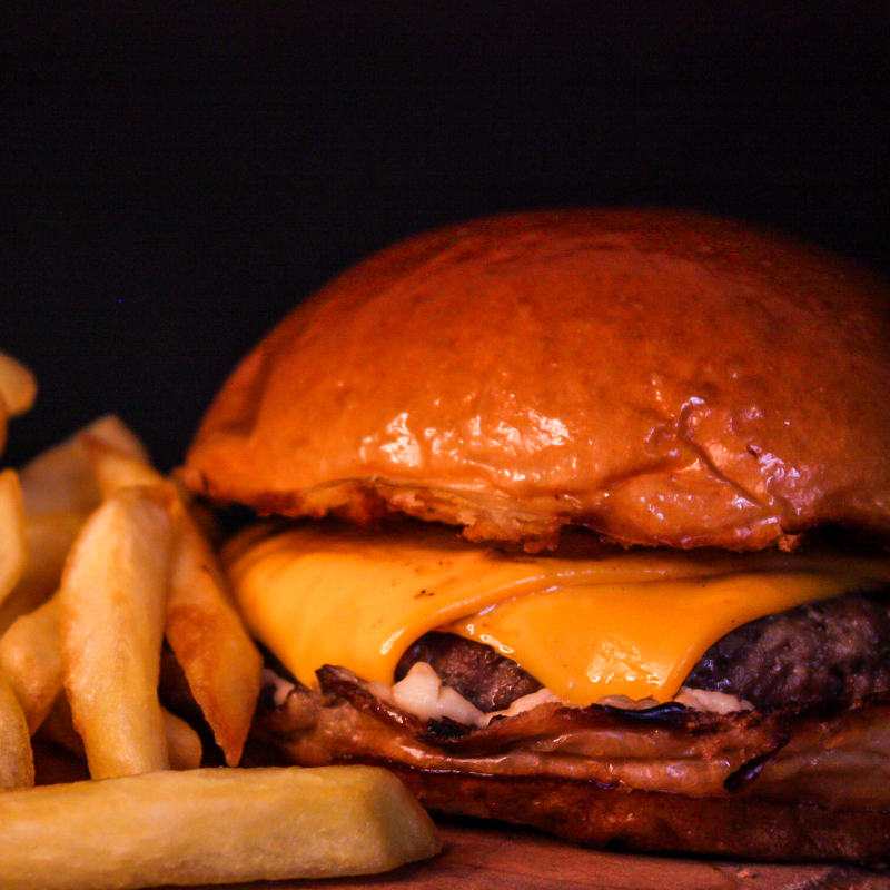 Pão brioche selado na manteiga, hambúrguer artesanal angus 150gr, bacon artesanal, queijo cheddar derretido e maionese da casa. Acompanha batata frita e maionese da casa.