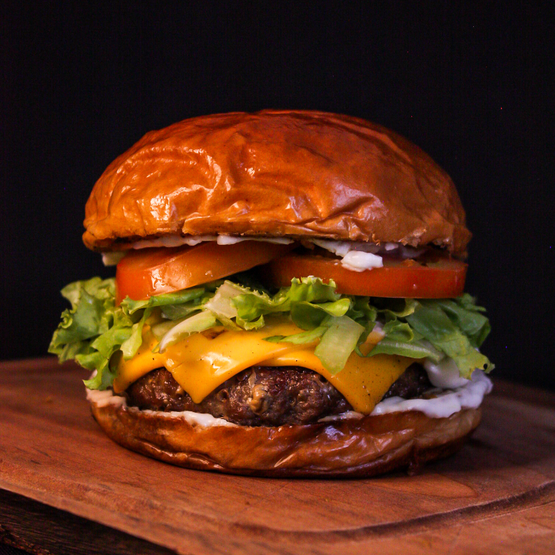Pão brioche selado na manteiga, hambúrguer artesanal angus de 150gr, alface, tomate, cebola roxa, queijo cheddar derretido e maionese da casa. Acompanha batata frita e maionese da casa.