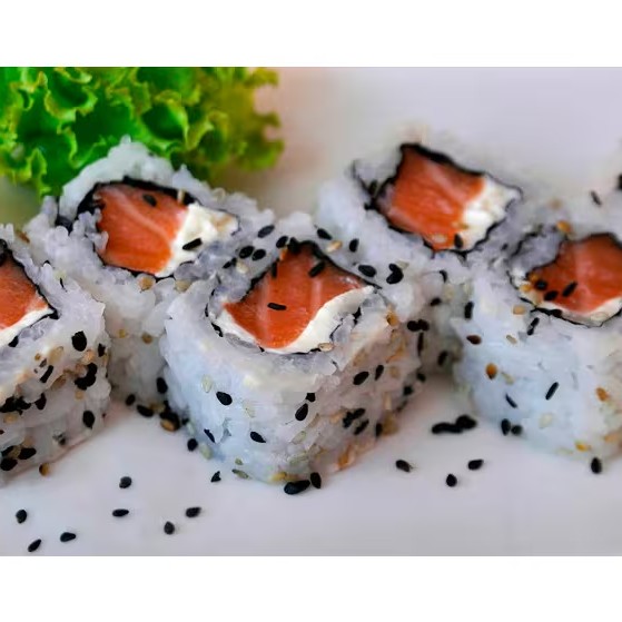 Recheio de salmão fresco com cream cheese e cebolinha, por fora arroz e alga