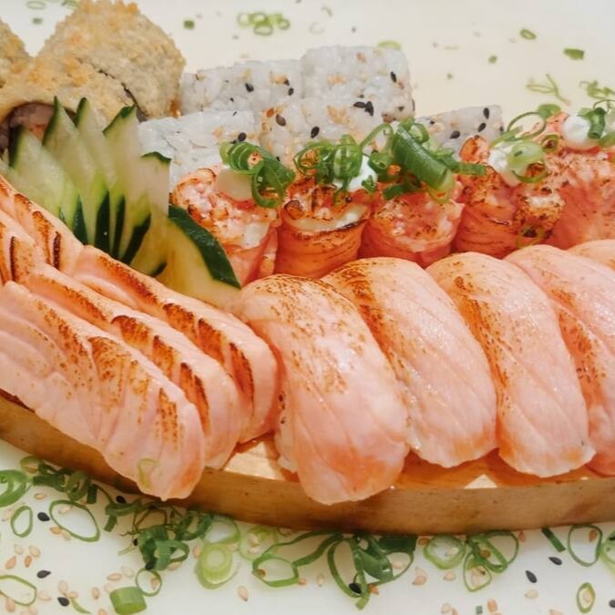 6 sashimi de salmão maçaricado, 5 joe salmão maçaricado, 5 niguiri de salmão maçaricado, 5 uramaki grelhado e 4 hot hol de salmão grelhado.