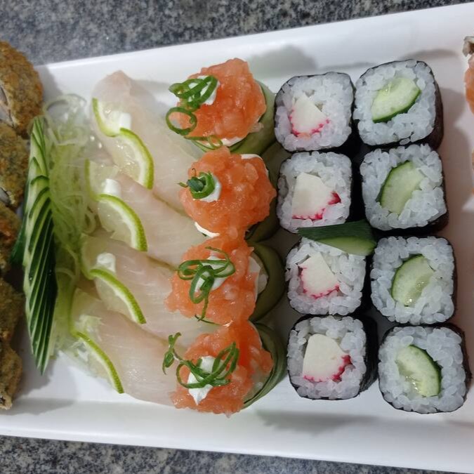 5 hot hol de salmão grelhado com cream cheese, 4 joe pepino com salmão, 4 joe salmão com cream cheese e shimeje, 4 hossomaki de pepdino, 4 hossomaki de kani e 4 niguiri de tilápia com cream cheese e limão.