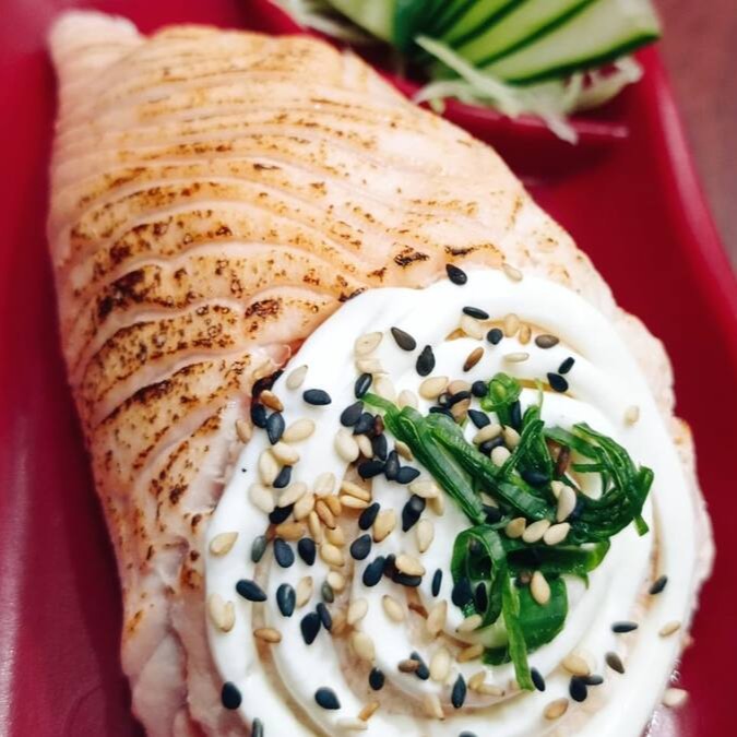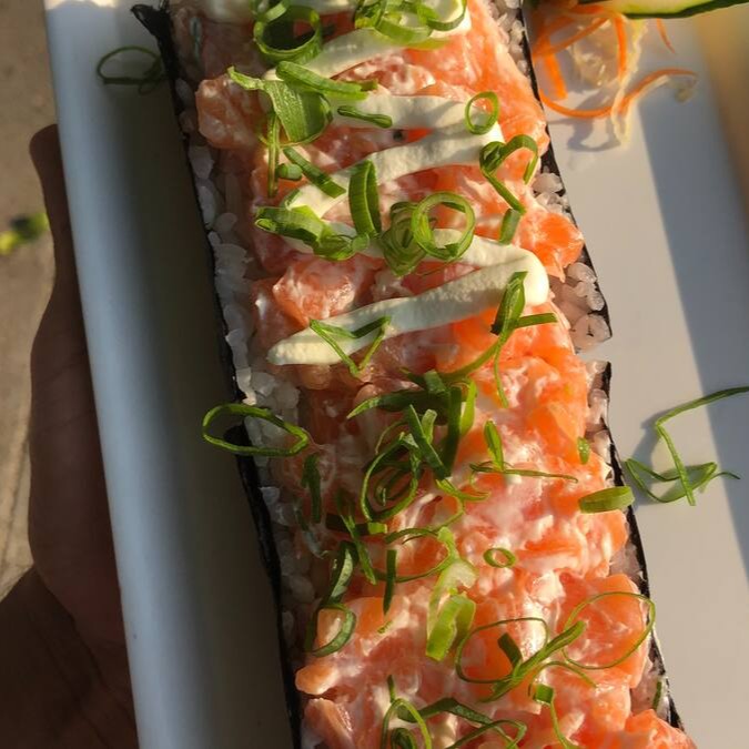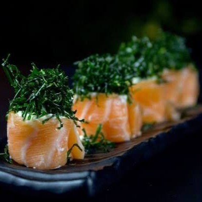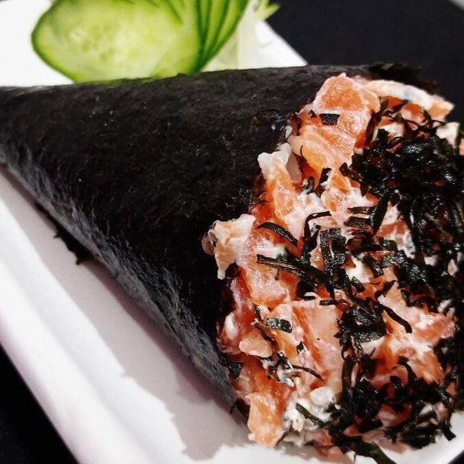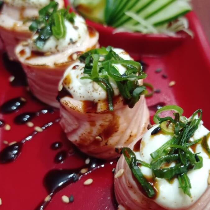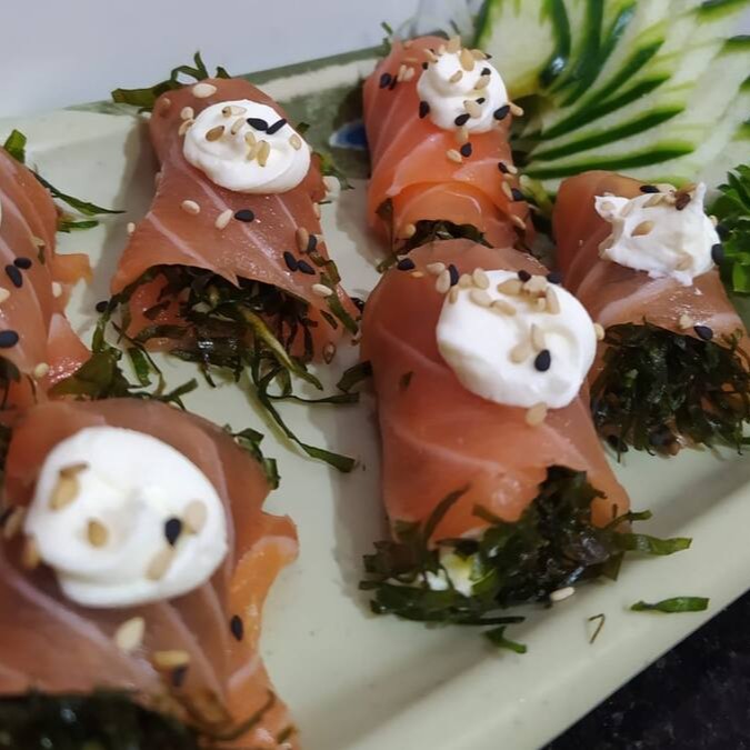 Salmão grelhado com cream cheese, enrolado com alga por fora.