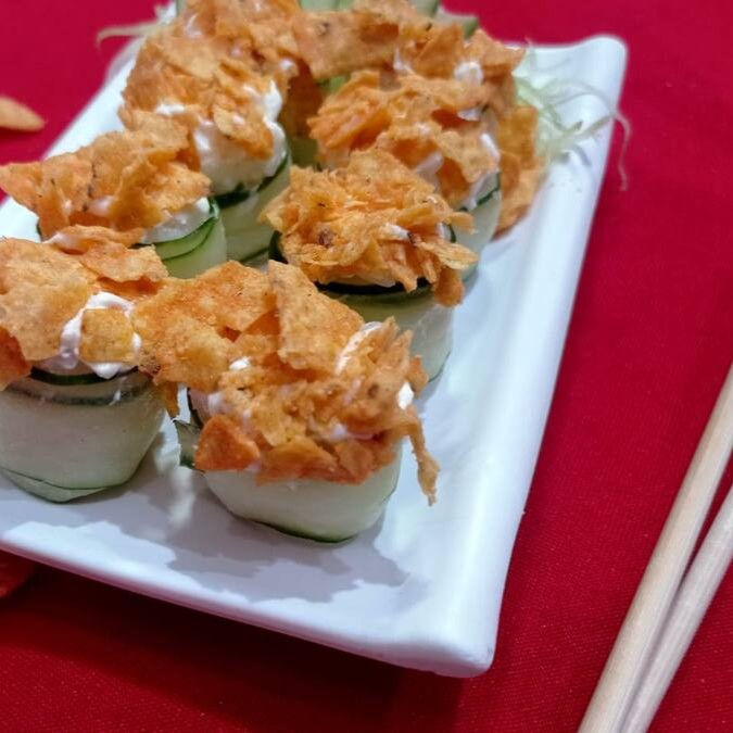 Pepino em volta do arroz, por cima cream cheese e Doritos
