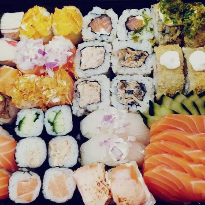 5 sashimi de salmão, 2 niguiri de salmão,2 niguiri skin com limão, 2 niguiri de tilápia com cebola roxa, 2 niguiris de kani, 2 joe de salmão com cebola roxa, 2 joe de salmão com bata cryspi, 2 joe pepino com Doritos, 2 uramaki de salmão, 2 uramaki de salmão grelhado, 2 uramaki skin, 2 uramaki skin com uma fita de salmão maçaricado, 3 hot hol com couve cryspi, 3 hot hol tradicional, 2 hossomaki de salmão, 2 hossomaki de salmão grelhado e 2 hossomaki de pepino.