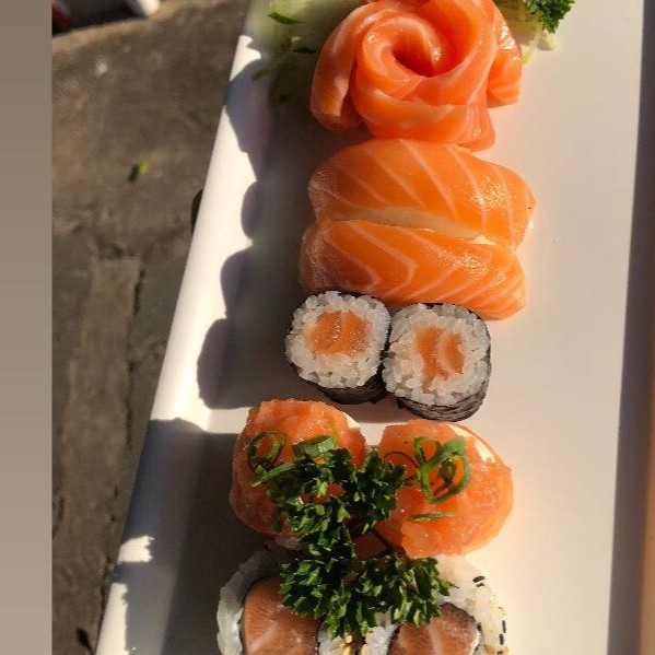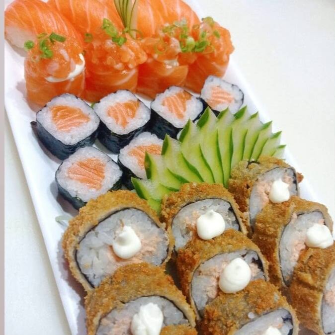 8 sashimi de salmão, 6 niguiri de salmão, 6 joe de salmão cream cheese, 4 uramaki de salmão cream cheese e 6 hossomaki de salmão.