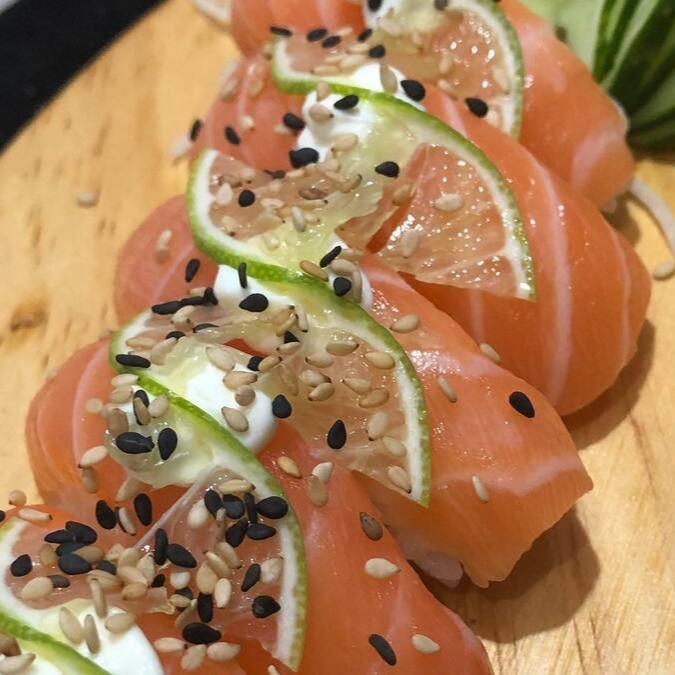 Arroz com uma fita de salmão fresca por cima, cream cheese, limão e gergelim