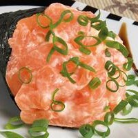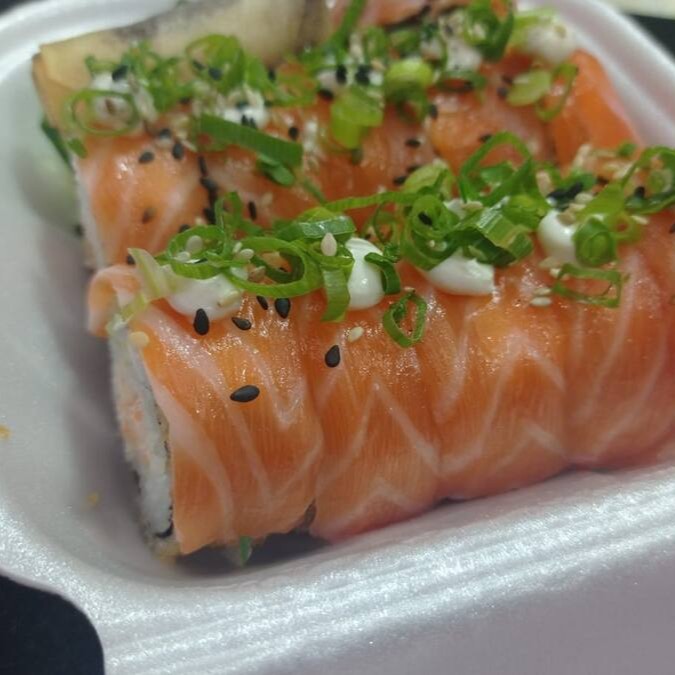 Recheio, salmão fresco ou salmão grelhado com cream cheese e cebolinha, por fora uma fita de salmão maçaricado, gergelim e cebolinha. Obs sem arroz. Em média 180g