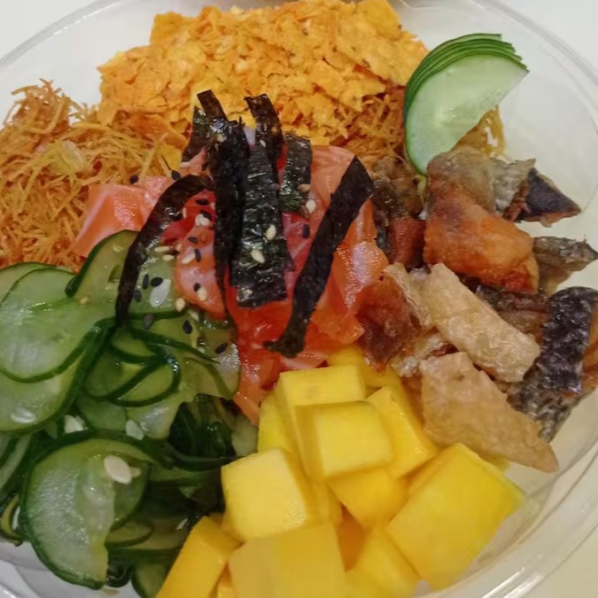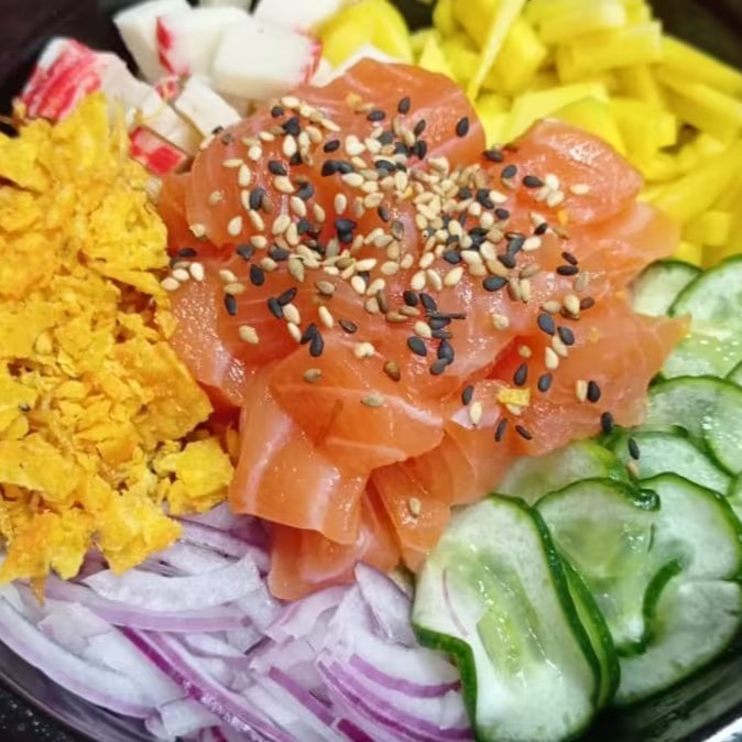 Delicie-se com nosso 'Poke 500 gramas', uma especialidade da categoria 'Poke Sc'. Este prato é primorosamente preparado com uma base de 120 gramas de arroz cuidadosamente temperado. A proteína, essencial para uma refeição balanceada, é composta por 120 gramas de salmão fresco, garantindo um sabor marítimo inigualável. Os complementos não ficam para trás, contando com a doçura da manga, a textura única da batata crispy, a ousadia dos Doritos, a acidez do sunomono e o irresistível toque final do skin crocante. Com certeza, uma refeição para encantar os paladares mais exigentes!
