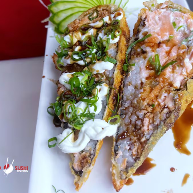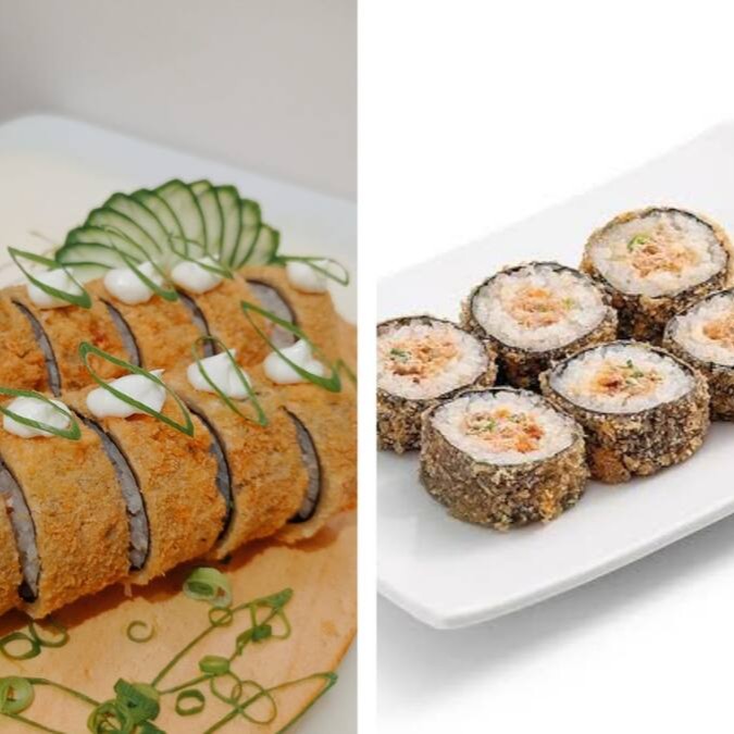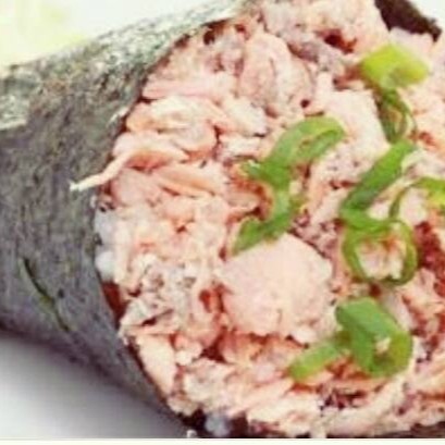 Recheio de salmão empanado e frito e cream cheese. Enrolado em uma fita de salmão maçaricado, cream cheese e cebolinha. Obs sem arroz