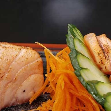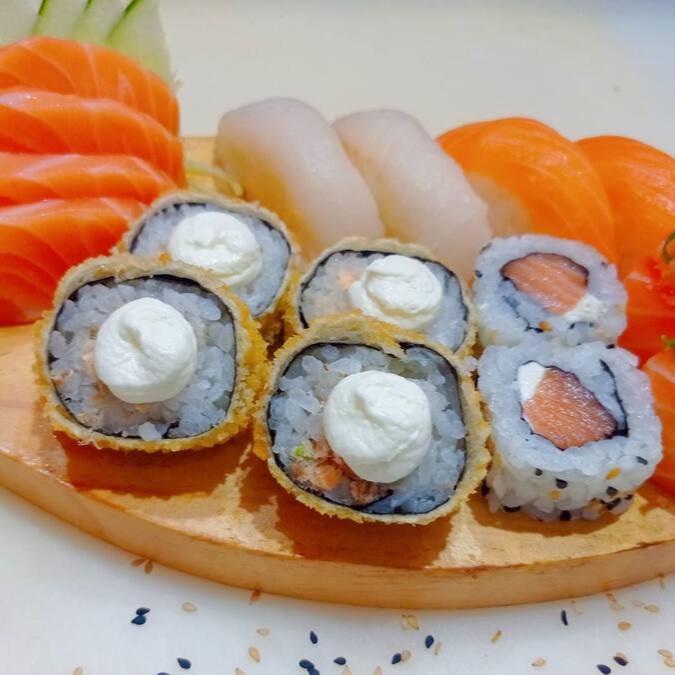 4 sashimi de salmão, 2 niguiri de salmão, 2 niguiri de tilápia, 2 joe salmão cream cheese e cebolinha, 2 uramaki salmão e 4 hot hol de salmão cream cheese.