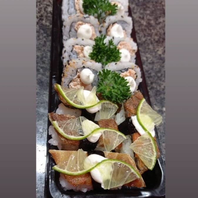 4 niguiri skin com cream cheese e limão, 4 uramaki skin, 4 uramaki grelhado, 4 hossomaki grelhado, 4 hot hol e 1 temaki salmão grelhado com cream cheese e cebolinha...