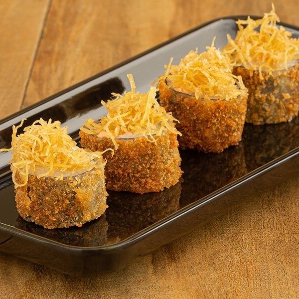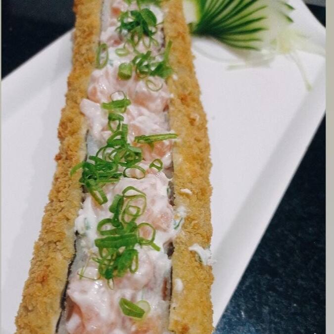 Recheio de salmão empanado e frito e cream cheese. Enrolado em uma fita de salmão maçaricado e cebolinha.