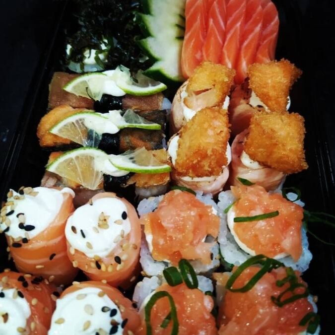 4 sashimis de salmão, 4 hot hol de salmão grelhado e cream cheese ,2 uramaki de salmão fresco com cream cheese, 2 uramaki de salmão grelhado, 2 Joe pepino com salmão, 2 Joe de salmão com Doritos, 3 hossomaki skin, 3 hossomaki de pepino, 3 hossomaki de salmão e 3 niguiri skin com cream cheese e limão.
